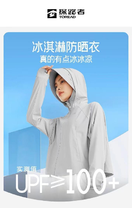 以探路者推出的“夏日全能王冰淇淋防曬衣”為例,品牌官方數(shù)據(jù)顯示其采用的TiEF SKIN-X2蝶影仿生雙重防曬技術(shù)可有效阻隔95%的紫外線,面、頸、手全包裹達(dá)到全方位防護(hù),與此同時,接觸瞬間涼感系數(shù)為0.24,遠(yuǎn)超國際標(biāo)準(zhǔn)60%;外形設(shè)計(jì)上,探路者對此系列產(chǎn)品采用了時下流行的冰淇淋色系,改變了常規(guī)防曬衣外形缺乏時尚元素的短板……