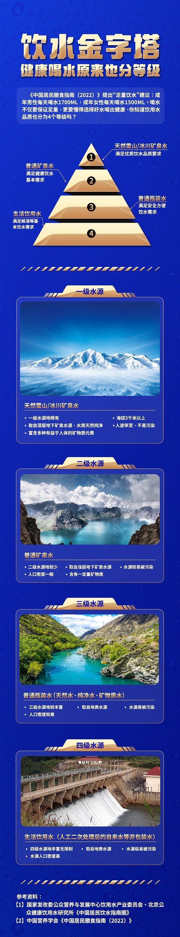 健康時(shí)報(bào)官方平臺發(fā)布了飲水金字塔科普長圖,以水源地為核心標(biāo)準(zhǔn)將日常飲用水分為四級,包括高海拔雪山冰川礦泉水、普通礦泉水、江河湖泊水及自來水。雪山/冰川礦泉水作為一級好水,大多來自于海拔3000米以上的雪山冰川地區(qū),富含均衡豐富的礦物質(zhì),長期飲用對健康大有裨益。