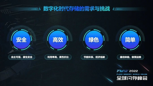 同時,在用戶側(cè),對安全、高效、綠色、簡單的要求成為數(shù)字化時代對于存儲的需求核心。自主可信、原生安全,利用率高、高性價比,節(jié)能環(huán)保、經(jīng)濟低碳,最佳體驗、極簡運維等具體需求為存儲發(fā)展提出新挑戰(zhàn)。