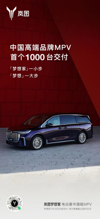 ??就在論壇開幕的前一天,嵐圖電動(dòng)豪華旗艦MPV嵐圖夢(mèng)想家完成第1000臺(tái)用戶交付,也因此成為中國(guó)高端電動(dòng)MPV市場(chǎng)首個(gè)累積交付破千的品牌。