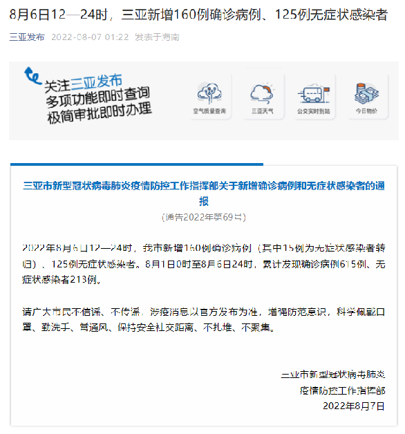 2022年8月6日12—24時,海南省三亞市新增160例確診病例(其中15例為無癥狀感染者轉(zhuǎn)歸)、125例無癥狀感染者。8月1日0時至8月6日24時,累計發(fā)現(xiàn)確診病例615例、無癥狀感染者213例。