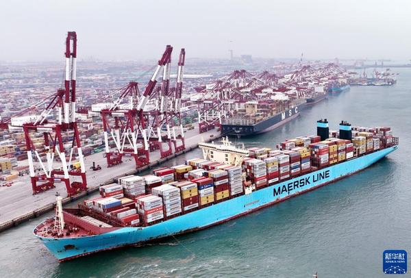在山東港口青島港前灣碼頭,歐洲貿(mào)易航線的“美途馬士基”集裝箱貨輪解纜起航(2022年7月29日攝,無人機(jī)照片)。新華社記者 李紫恒 攝
