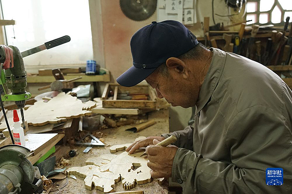 8月26日,楊增貴在木料上雕刻花紋。新華社記者解統(tǒng)強 攝