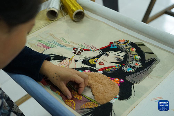 8月26日,在湟源縣丹噶爾皮繡研制開發(fā)有限公司,繡娘制作皮繡。新華社記者解統(tǒng)強 攝
