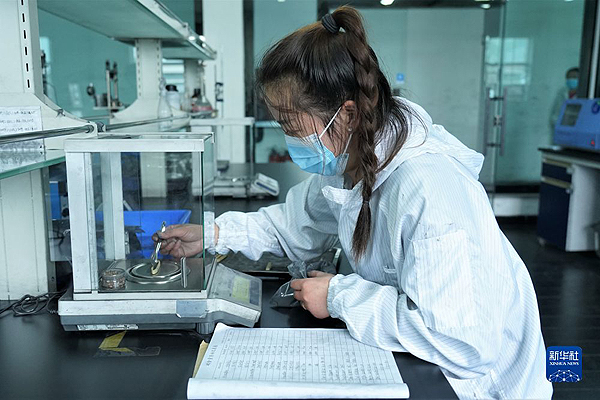 正值秋季生產期,位于湟源縣的青海凱金新能源材料有限公司產品檢測中心實驗室內,工作人員正在對生產出的新一批負極材料品質進行測試。