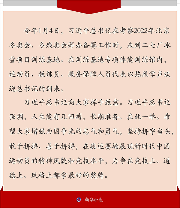 習(xí)近平總書記向大家揮手致意。習(xí)近平總書記強(qiáng)調(diào),人生能有幾回搏,長期準(zhǔn)備、在此一舉。希望大家增強(qiáng)為國爭光的志氣和勇氣,堅持拼字當(dāng)頭,敢于拼搏、善于拼搏,在奧運(yùn)賽場展現(xiàn)新時代中國運(yùn)動員的精神風(fēng)貌和競技水平,力爭在競技上、道德上、風(fēng)格上都拿最好的獎牌。