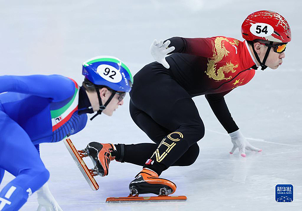 2022年2月5日,在首都體育館舉行的北京2022年冬奧會短道速滑項(xiàng)目混合團(tuán)體接力決賽中,中國隊奪得冠軍。這是中國隊選手任子威(右)在比賽中。新華社記者 蘭紅光 攝