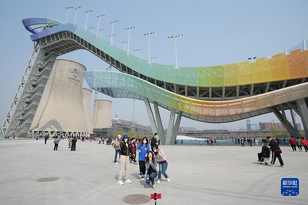 游客在北京首鋼滑雪大跳臺(tái)區(qū)域參觀游覽(2022年4月4日攝)。新華社記者 鞠煥宗 攝