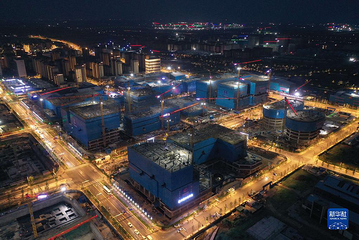 雄安新區(qū)容東片區(qū)雄安·電建智匯城建設(shè)項(xiàng)目夜景(2022年8月17日攝,無(wú)人機(jī)照片)。新華社記者 朱旭東 攝