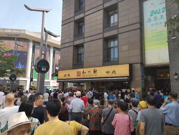 消費(fèi)者在排隊購買知味觀的鹵味熟食和點心糕點等產(chǎn)品。(受訪者供圖)