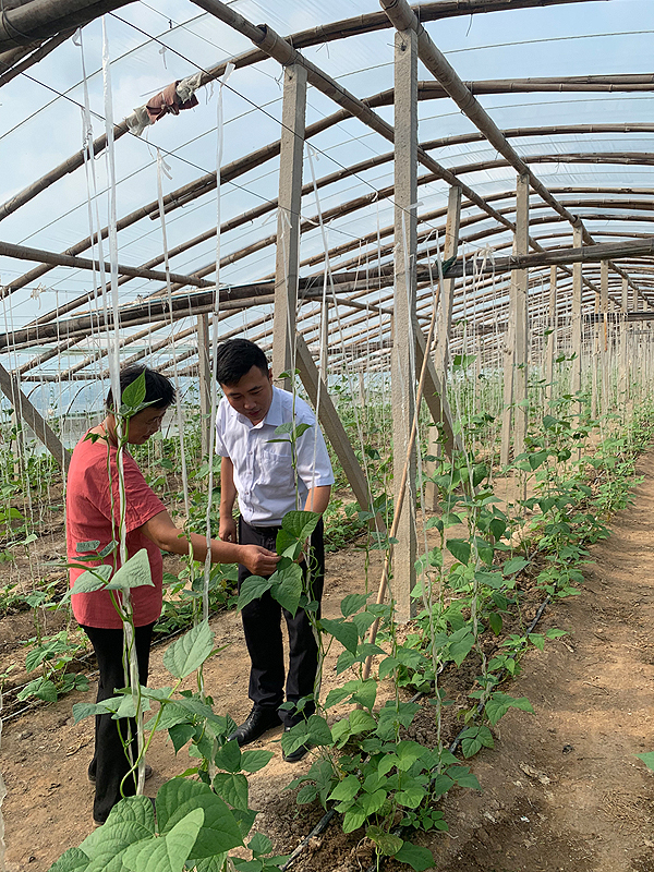 陽谷村行微小一隊客戶經(jīng)理呂緒陽在孫樓社區(qū)指導(dǎo)黃瓜掐花技術(shù)(資料照片)