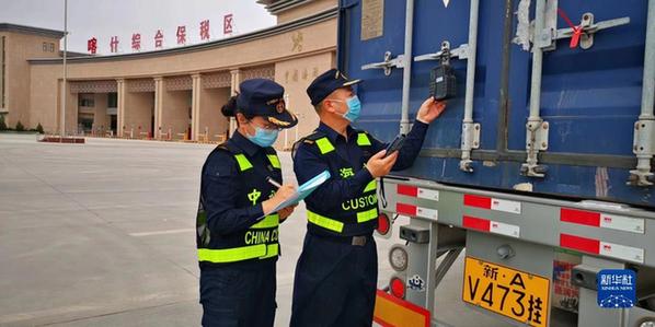 海關現(xiàn)場關員在喀什綜合保稅區(qū)登記入?yún)^(qū)車輛電子鎖信息(2022年9月14日攝)。新華社發(fā)(圖爾罕·麥麥提伊敏 攝)