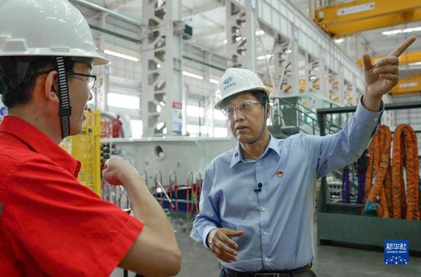 在金風科技新疆達坂城風電裝備產(chǎn)業(yè)基地零碳智能工廠內(nèi),武鋼(右)與技術(shù)工程師在一起交流(2022年8月6日攝)。新華社發(fā)