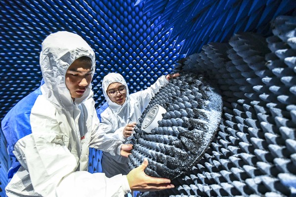 在寧波曙翔新材料股份有限公司實(shí)驗(yàn)室內(nèi),研發(fā)人員對(duì)航天產(chǎn)品進(jìn)行數(shù)據(jù)測(cè)試。(丁繼敏 攝)