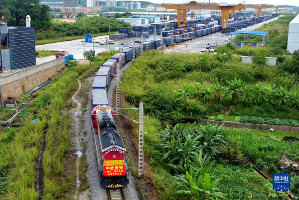 搭載2600噸白糖的中歐班列從南寧國際鐵路港出發(fā)駛向哈薩克斯坦阿拉木圖(2022年5月15日攝,無人機(jī)照片)。新華社記者 張愛林 攝