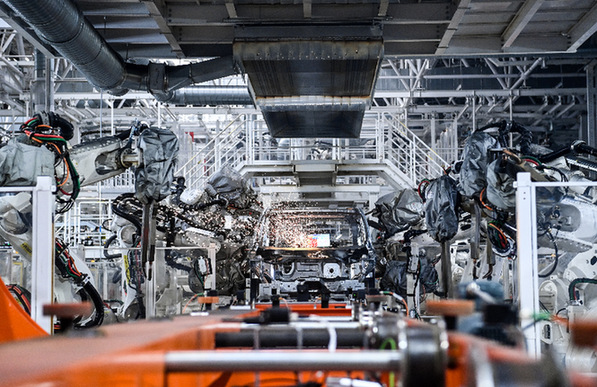 在吉林長春中國第一汽車集團有限公司紅旗繁榮工廠焊裝車間內,焊裝機器人在生產線上焊接車身?!⌒氯A社記者 顏麟蘊 攝