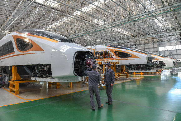 在中車長春軌道客車股份有限公司高速動車組裝配車間里,高級技師胡俊祥(右)與同事馬洪偉檢查“復興號”高鐵列車電氣系統(tǒng)。 新華社記者 張楠 攝