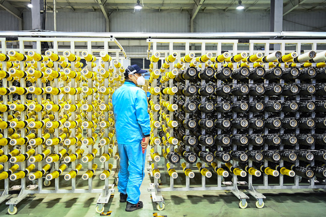在吉林化纖集團(tuán)國(guó)興碳纖維公司生產(chǎn)車間內(nèi),工人整理碳纖維原絲。