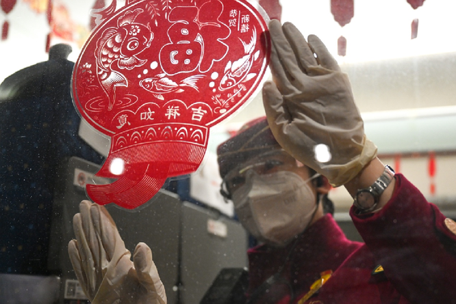 整裝待發(fā)的乘務(wù)人員佩戴手套、口罩、眼鏡的防護(hù)“三件套”迎接每一位旅客,列車長還送上了吉祥兔胸針小禮物和溫馨祝福。