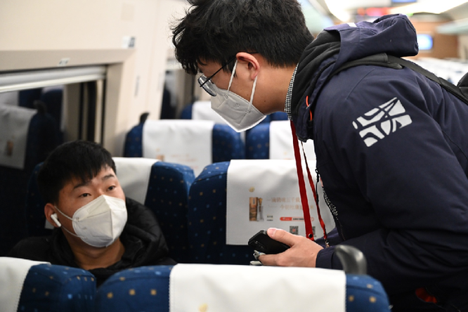同車的孫先生則要趕往石家莊。在鐵路部門工作的他為了支援春運(yùn)工作起了個(gè)大早,剛接受完記者采訪就閉上眼睛休息了起來?!斑@次疫情防控政策優(yōu)化調(diào)整后,好多人都選擇回家過年,希望我的工作可以幫助到大家?!睂O先生說。