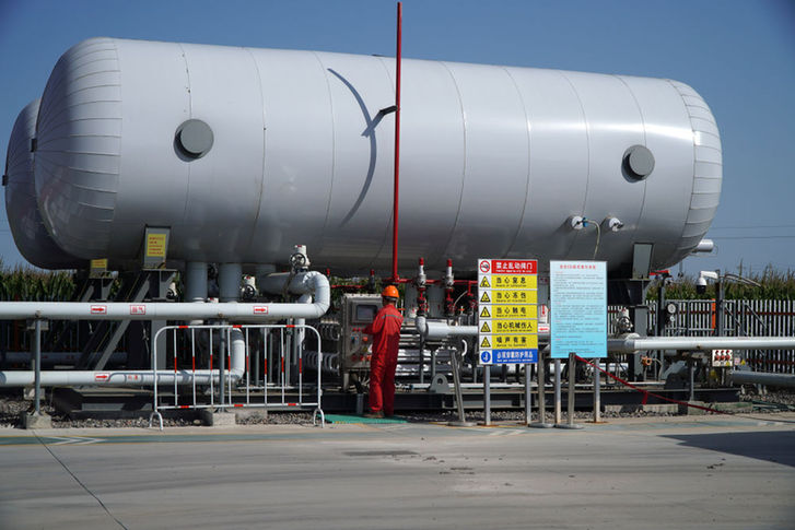 齊魯石化—勝利油田百萬噸級碳捕集、利用與封存項目10號注氣站,一名工作人員在檢查設(shè)備。記者 徐速繪 攝