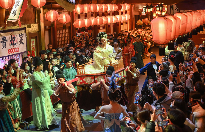 ??? 游客觀看長安十二時辰主題街區(qū)表演。 記者 鄒競一 攝