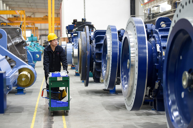 2月13日,工人在南高齒(包頭)傳動設備有限公司生產(chǎn)車間內作業(yè)。