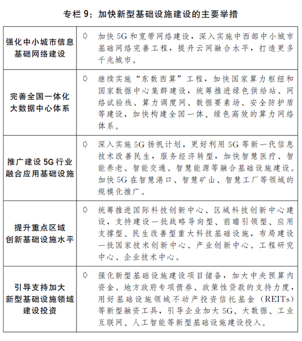 (計(jì)劃報(bào)告中的專欄9:加快新型基礎(chǔ)設(shè)施建設(shè)的主要舉措)