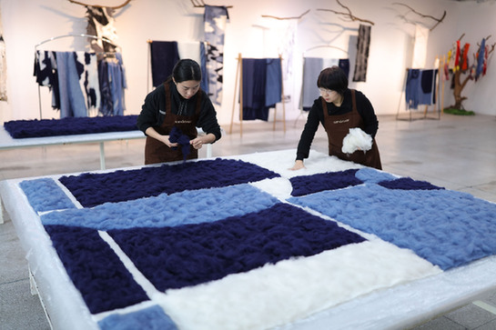 問(wèn)起“回到源頭”的工藝,最大的訣竅是什么?郭秀玲坦然地說(shuō),用手“慢慢地、耐心地拍”。在耐心拍的過(guò)程中,不同著色的羊絨,它們的細(xì)纖維彼此自然地“拍合”。藝術(shù)設(shè)計(jì),不再是由流水線說(shuō)一不二地完成,而是在人手與自然材質(zhì)的“可能性”中呈現(xiàn)。所以,每一件制品,都是“這一個(gè)”,沒(méi)有完全雷同的。