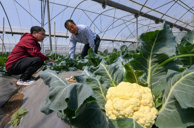 國(guó)家大宗蔬菜產(chǎn)業(yè)技術(shù)體系花椰菜育種崗位專家孫德嶺(右)與副研究員牛國(guó)保在實(shí)驗(yàn)地里調(diào)查不同試驗(yàn)組合花椰菜種長(zhǎng)勢(shì)情況。新華社記者 孫凡越 攝