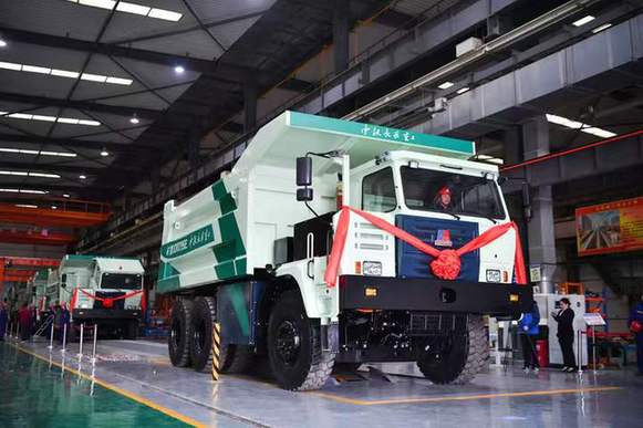 位于西安市北部的閻良區(qū)的中鐵長(zhǎng)安重工有限公司,工人在生產(chǎn)線上試乘即將下線的95噸純電動(dòng)礦用自卸車。記者 張博文 攝