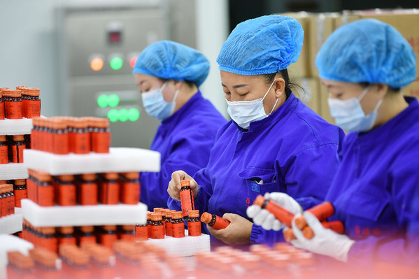 在寧夏銀川市賀蘭縣一家枸杞深加工企業(yè),工作人員在生產(chǎn)線上包裝枸杞深加工產(chǎn)品。記者 王鵬 攝