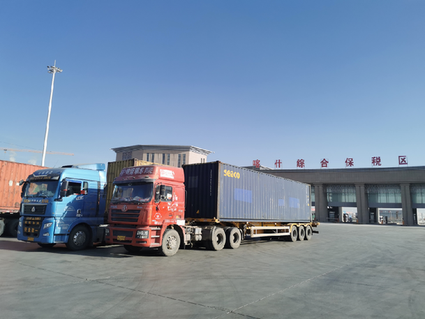 在喀什綜保區(qū)門前,貨車有序等待通行。新華社記者劉紅霞 攝