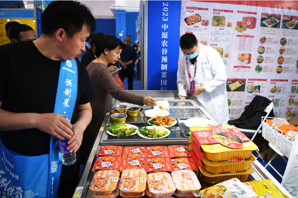 4月10日,參觀者在中原農(nóng)谷預(yù)制菜國際博覽會上品嘗加工好的預(yù)制食品。