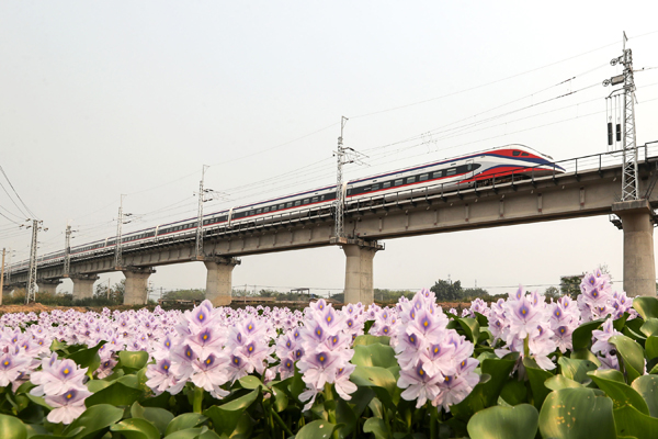 4月13日,從老撾萬象站駛出的D888次“瀾滄號”列車行駛在云南省西雙版納州境內(nèi)的中老鐵路橄欖壩特大橋上。