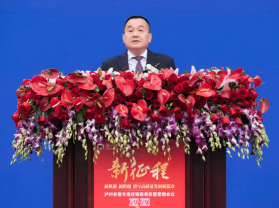 圖為瀘州老窖集團(tuán)及股份公司黨委書(shū)記、董事長(zhǎng)劉淼在2022-2023瀘州老窖年度經(jīng)銷(xiāo)商表彰暨營(yíng)銷(xiāo)會(huì)議上發(fā)言