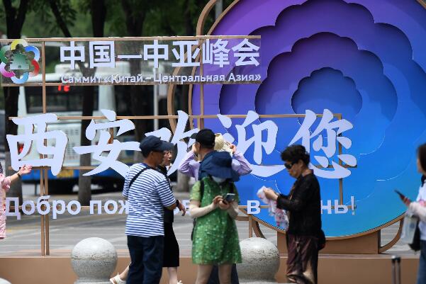 5月16日,游客在西安市北大街上與中國-中亞峰會主題裝置合影。