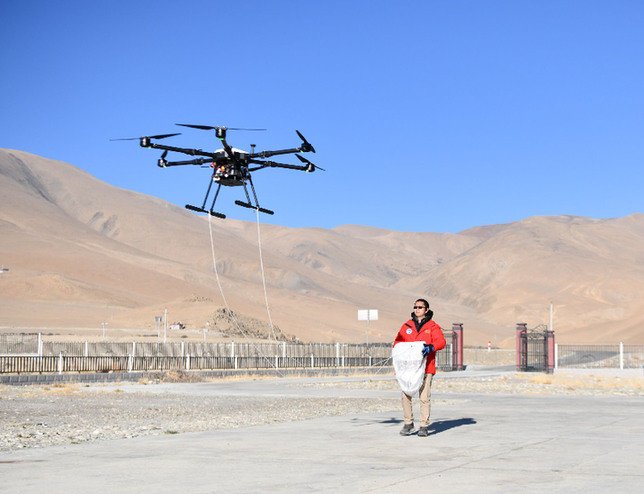 在中國(guó)科學(xué)院珠穆朗瑪大氣與環(huán)境綜合觀測(cè)研究站,科考隊(duì)員放飛無(wú)人機(jī)采集空氣樣本(5月10日攝)。