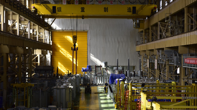 裝配車間內(nèi),工人們正在進行高速鐵路牽引變壓器的裝配及真空注油工作。記者 李旭倫 攝
