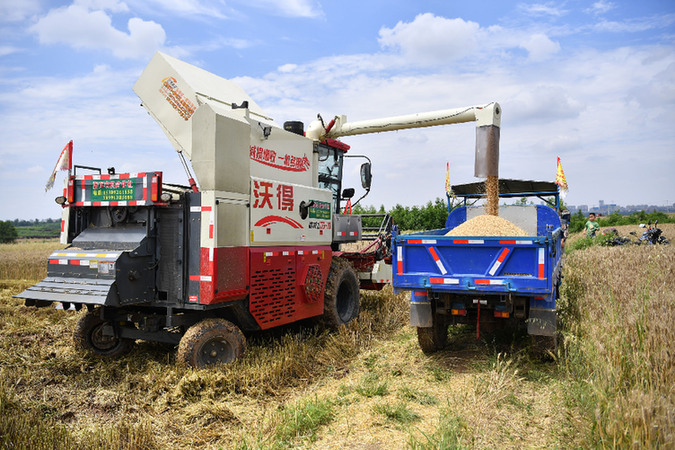在西安市鄠邑區(qū)渭豐街道真守村,幾臺(tái)履帶式收割機(jī)一刻不停地在連片麥田里“聯(lián)合”作業(yè),將谷倉填滿倒入翻斗車后,這些收割機(jī)又馬不停蹄地調(diào)轉(zhuǎn)機(jī)頭,再入麥田。“今年夏收已經(jīng)比往年晚了三四天,再不抓緊,就真的‘九成熟、十成收;十成熟、一成丟’了。”來不及停頓片刻,收割機(jī)駕駛員王成旭又在另一壟麥田,繼續(xù)著機(jī)收作業(yè)。