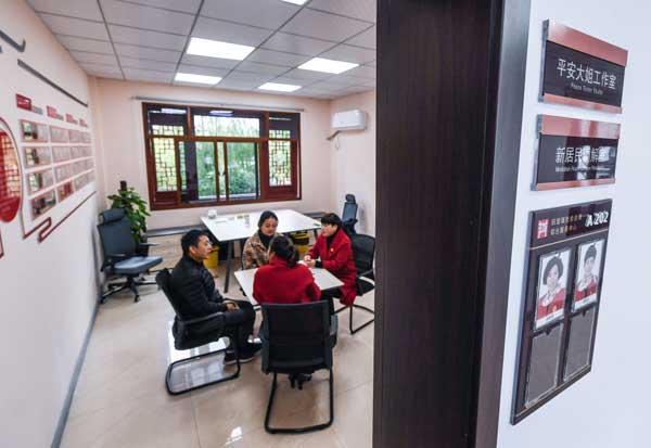 在浙江省湖州市織里鎮(zhèn)社會治理綜合服務中心調(diào)解室,“平安大姐”工作室的志愿者對一起糾紛進行調(diào)解(2019年11月29日攝)。新華社記者 徐昱 攝