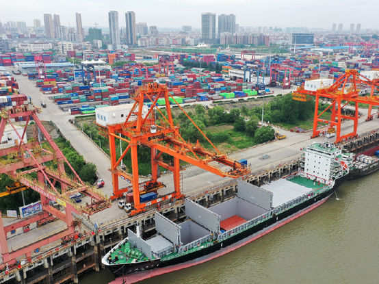 “華航漢亞2號”貨輪??吭谖錆h新港陽邏集裝箱碼頭進(jìn)行裝箱作業(yè)(2020年5月9日攝,無人機(jī)照片)。新華社發(fā)(趙軍 攝)