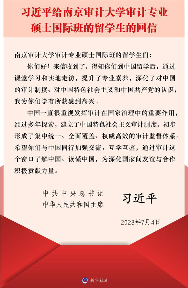 習(xí)近平在回信中說,得知你們到中國留學(xué)后,通過課堂學(xué)習(xí)和實(shí)地走訪,提升了專業(yè)素養(yǎng),深化了對中國的審計(jì)制度、對中國特色社會(huì)主義和中國共產(chǎn)黨的認(rèn)識,我為你們學(xué)有所獲感到高興。
