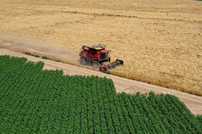 在新疆呼圖壁縣五工臺鎮(zhèn)小泉村,農(nóng)機(jī)手駕駛聯(lián)合收割機(jī)收割小麥(7月15日攝,無人機(jī)照片)。