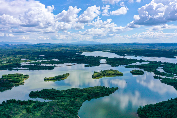 8月6日,湖南桂陽舂陵國家濕地公園,綠水、濕地、藍天相映成趣,構(gòu)成一幅秀美的夏日生態(tài)畫卷(無人機照片)。