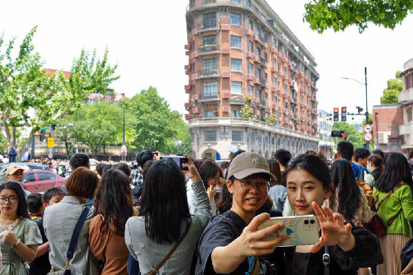 游客在上海武康大樓前拍照留念(2023年4月30日攝)。新華社記者 辛夢(mèng)晨 攝