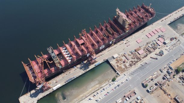 這是中船(天津)船舶制造有限公司廠區(qū)一艘已經(jīng)下水準(zhǔn)備交付的船舶(無人機(jī)照片)。記者 趙子碩 攝