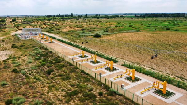 中國(guó)石油長(zhǎng)慶油田蘇里格南作業(yè)分公司的無人值守智能遠(yuǎn)程開關(guān)叢式井組(無人機(jī)照片)。記者 王鵬 攝