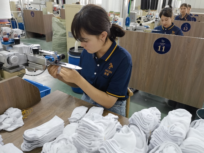 朱力姑·阿布拉沒成想,沒有投入一分錢,只出員工和場地,僅收取生產(chǎn)管理費每年就多了5萬元。她將家中的蔬菜大棚改成棉襪生產(chǎn)車間,而定型機、縫投機、襪版、臺桌等設(shè)備安裝、生產(chǎn)用電等均由企業(yè)提供,自己只需叫上左鄰右舍的姐妹們加入,企業(yè)提供崗前培訓(xùn),并由老師傅傳幫帶。隨著用工熟練程度不斷加深,姐妹們從最初的人均月收入1500元增加到現(xiàn)在的人均月收入3500元不等。