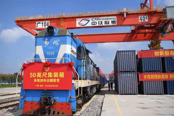 9月20日,50英尺集裝箱多聯(lián)快車X802次貨運(yùn)列車從廣州國際港駛出,一路北上向著長沙而行。